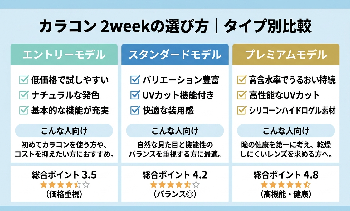 | 42 | 【10%OFFクーポン!】 カラコン コンタクトレンズ 2week ツーウィークビューティーUV (1箱6枚入) 度あり 度なし 14.0mm 2ウィーク カラーコンタクトレンズ コンタクト 2週間 | ¥2,806税込 | ★★★★★4.4 105件 | UV機能付きでデイリーに使えるシンプルなカラコンを低価格で試してみたい初心者の方に向いています。 |
