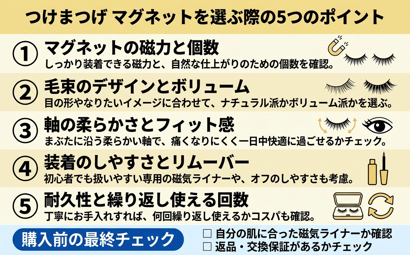 | 22 | つけまつげ マグネット 5ペア マグネットアイライナー2本付き ナチュラル 磁石 マグネチック まつ毛 簡単 3Dカール仕上げ 時短メイク かんたん装着 繰り返し使え 接着剤不要 | ¥1,680税込 | ★★★★★4.1 25件 | 「マグネットまつげを使ったことがなくて失敗が怖い」「とにかく低価格でお試ししたい」という入門者の方に最適です。 |