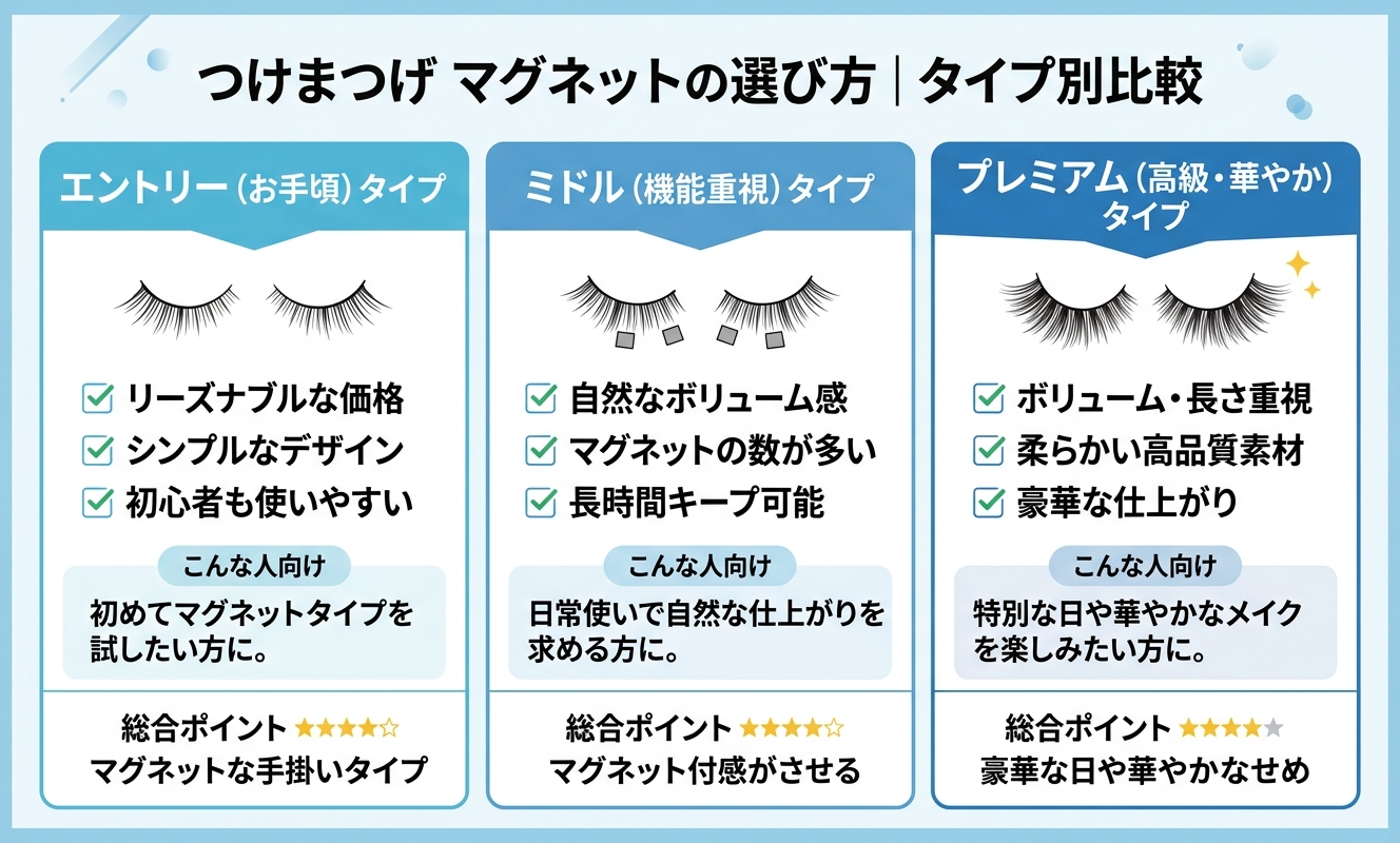 | 58 | トつけまつげ 一体型 全タイプ 磁石 マグネットつけまつげ 磁気つけまつげ ノリ不要の一体型マグネット設計 花粉症でも快適に装着可能 洗って繰り返し使える 超軽量で初心者でも簡単 自然な束感ですっぴん風 防水防汗で夏も安心 「ギフト」「クリスマス」「冬コフレ」 | ¥3,700税込 | ★★★★★4.6 5件 | 多少価格が高くても品質重視で、磁石式つけまつげに本格的に移行したいと考えている方に向いています。 |